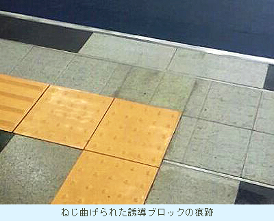 これは福岡市役所の誘導ブロックなのですが途中で曲げられた痕跡があります。