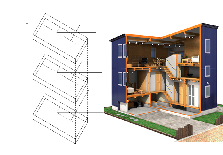どのように図示することができるかインターネットで、アクソメ図やパースで描かれたものを調べました。そこで下の2つの図を合わせたようなものを大きく配置しようと思いました。