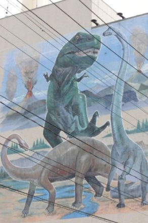 この恐竜の壁画は飯塚小学校から本町・東町商店街へ向かう