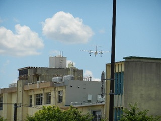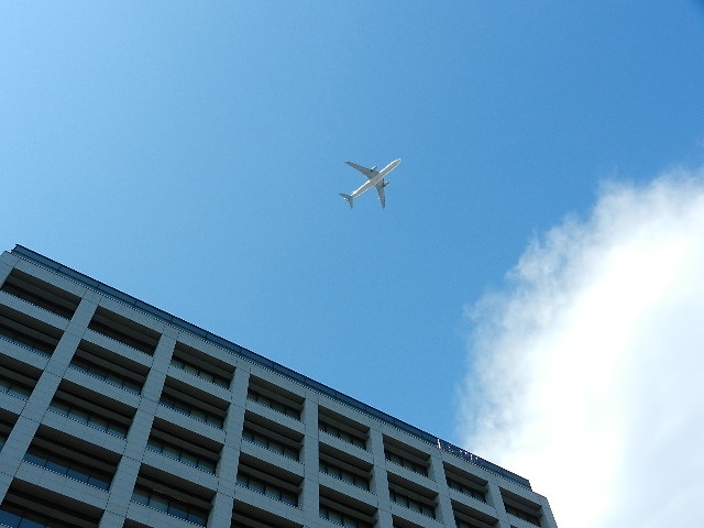 屋上には室外機が付いていて、その上を飛行機が通っていた