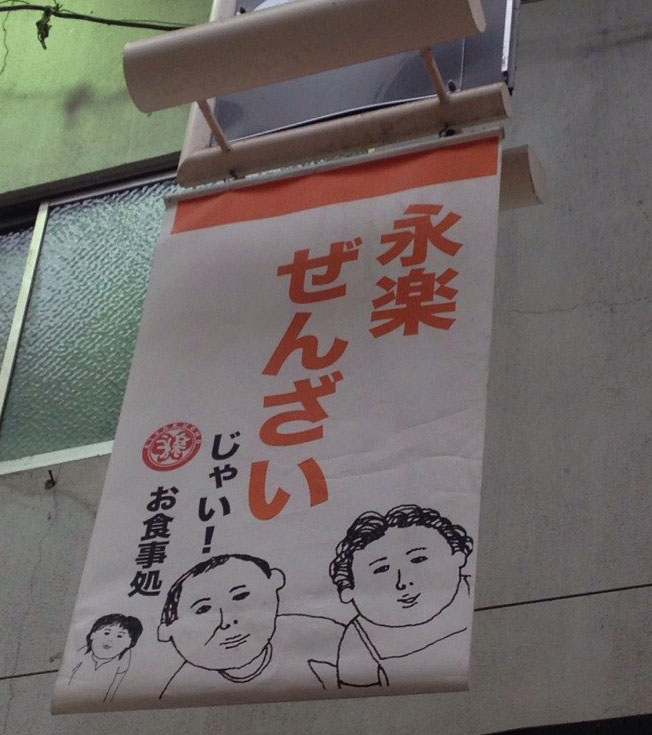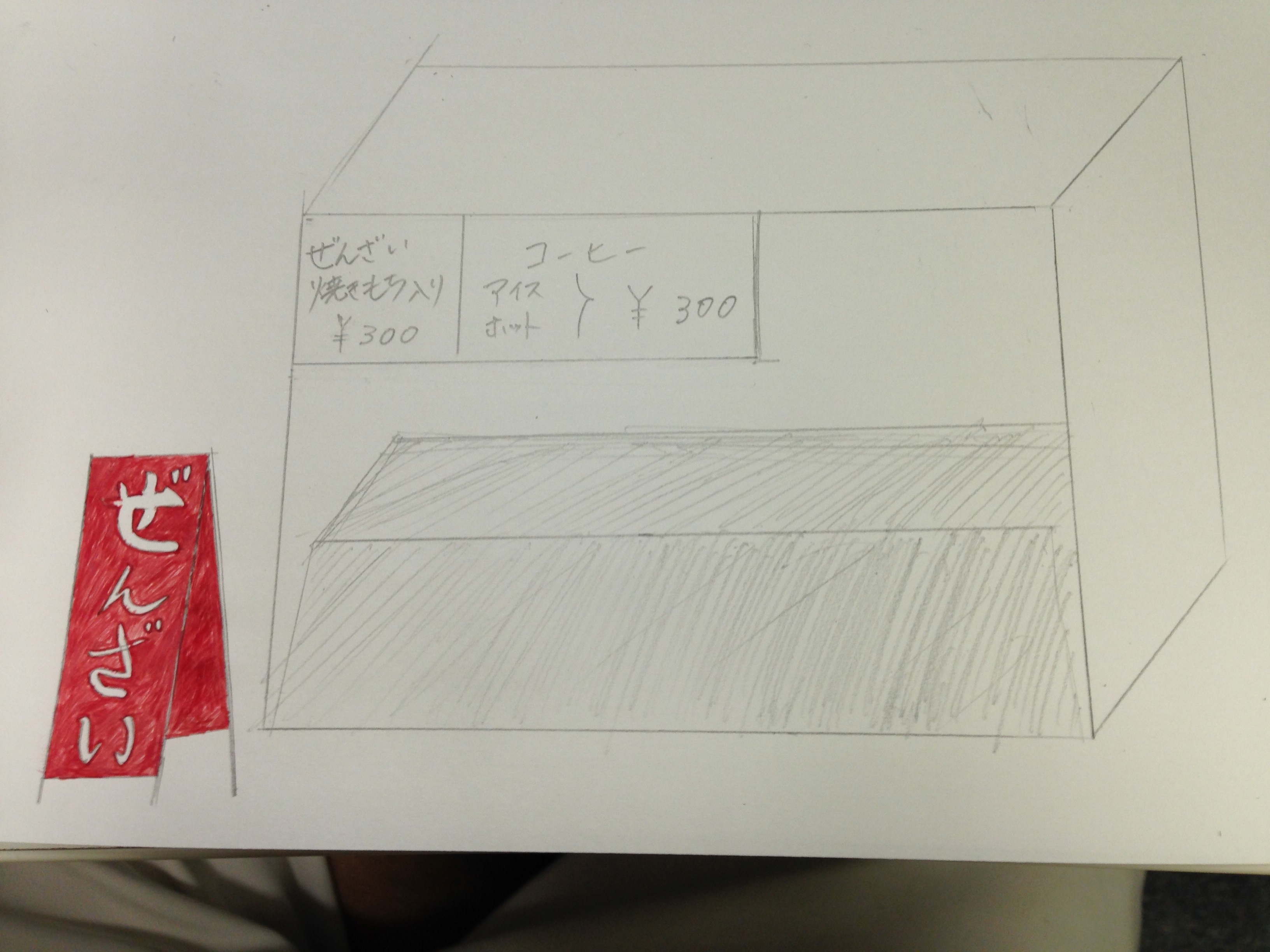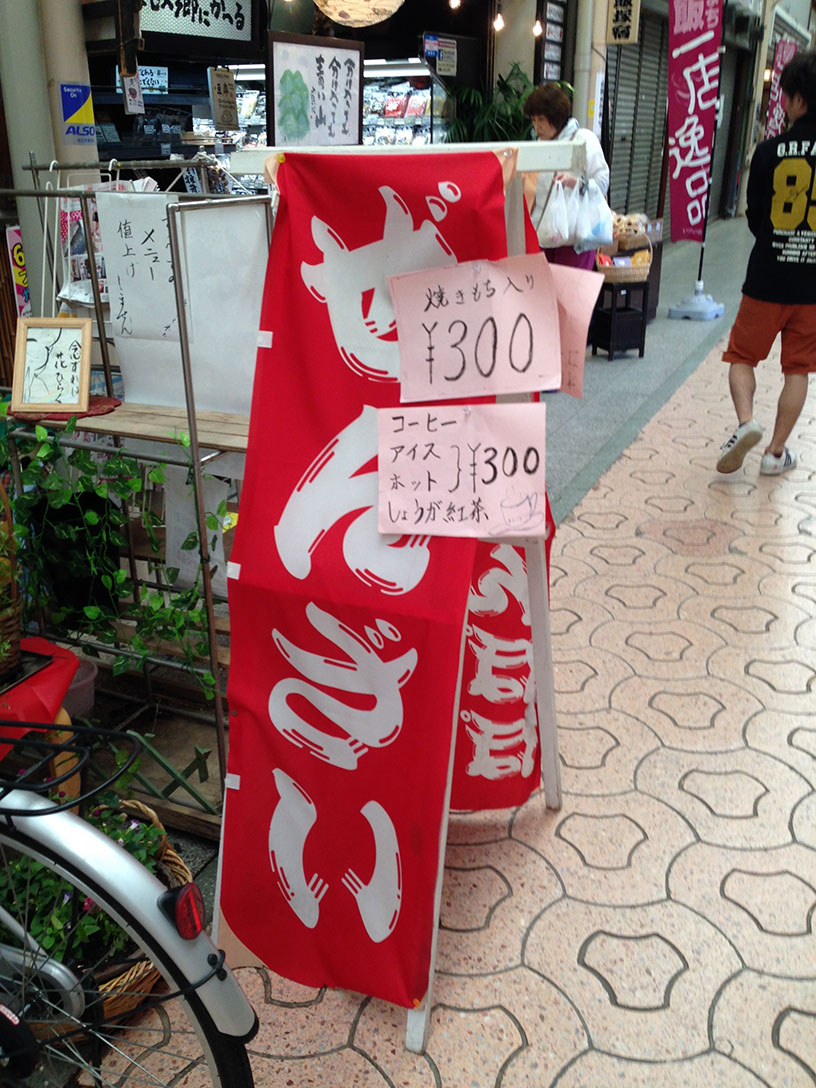 例えば、この画像だと[ぜんざい]とでかい看板で目立っている旗があるのに、焼きもち入り300円やコーヒー、しょうが紅茶などの雑な紙がぺたぺたと貼ってありました。自分が考えた工夫としてはぜんざいと書いてある旗に貼ってある紙をとって店の前に残します。そして、店の入り口に見えるように商品名の書いてある板のようなものを取り付けると見やすくて見栄えのいいものになると思います。